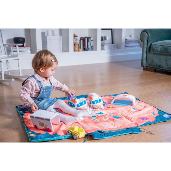 Mięciutka mata zapewni Twojemu dziecku wiele chwil wesołej zabawy. Do odkrycia czekają sensoryczne zakamarki, szeleszczące mosty, tunele, drogi i kieszonki - garaże na dwa urocze samochodziki. Maluch może z powodzeniem ćwiczyć małą motorykę. Zabawka przyczyni się także do prawidłowego rozwoju zmysłów dziecka. Matę można złożyć po skończonej zabawie, a autka schować w specjalnych kieszonkach.
