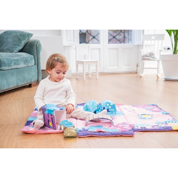 Mięciutka mata zapewni Twojemu dziecku wiele chwil wesołej zabawy. Do odkrycia czekają sensoryczne zakamarki, szeleszczące mosty, tunele, drogi i kieszonki - garaże na dwa urocze samochodziki. Maluch może z powodzeniem ćwiczyć małą motorykę. Zabawka przyczyni się także do prawidłowego rozwoju zmysłów dziecka. Matę można złożyć po skończonej zabawie, a autka schować w specjalnych kieszonkach.