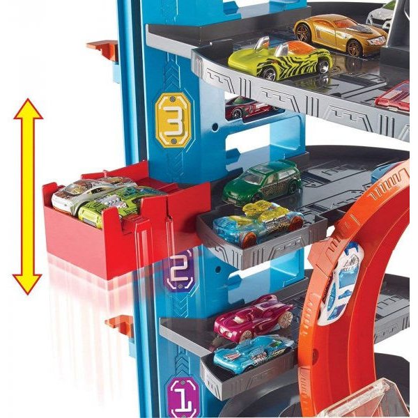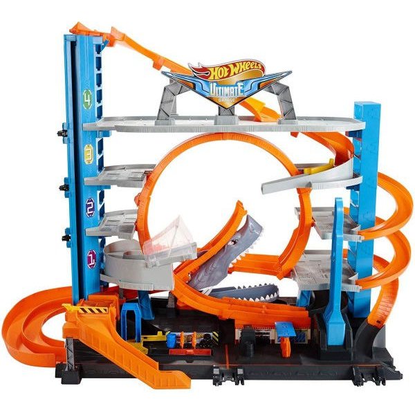 Mega zestaw to marzenie każdego małego i dużego fana super szybkich samochodzików Hot Wheels!Oprócz ogromnego garażu mieszczącego ponad 90 podstawowych autek Hot Wheels posiada wielki podwójny tor w kształcie pętli, wind oraz niebezpiecznego rekina, który tylko czeka by pożreć któreś z autek. Wznieś się na szczyt garażu za pomocą windy, a później ruszaj przed siebie. Sprawdź, jakie atrakcje czekają na ciebie!