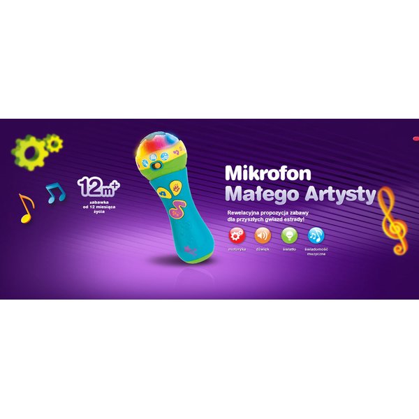 Mikrofon posiada wiele funkcji i niespodzianek, wygrywa wesołe melodie, wydaje zabawne dźwięki oraz miga kolorowymi światełkami. Gdy maluch naciśnie małą nutkę uruchomi wesołe melodie oraz migające światełka. Kiedy Maluszek naciśnie dużą nutkę i zacznie śpiewać usłyszy lekki pogłos.