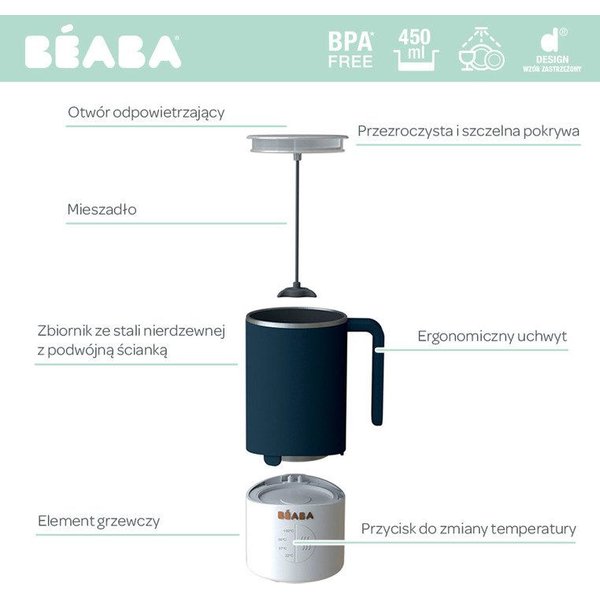 Innowacyjny ekspres do mleka Milk Prep francuskiej marki Beaba to urządzenie, za pomocą którego możemy przygotować swojemu maluchowi pyszny napój. Milk Prep składa się z 3 części: podgrzewacza, naczynia ze stali nierdzewnej z podwójna ścianką o pojemności 450 ml i ergonomicznym uchwytem z boku oraz transparentnej, przepuszczającej powietrze pokrywki ze zintegrowanym mieszadłem.