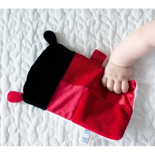 Zabawka utrzymana jest w kontrastowych kolorach: bieli, czerni oraz czerwieni, które stymulują zmysł wzroku dziecka. Kolorowe metki oraz uszka do gryzienia i pociągania zainteresują maluszka i skłonią do ćwiczenia rączki i chwytania, a szeleszczące elementy będą wpływać korzystnie na rozwój słuchu. Mini szeleścik z serii Mr B sprawdzi się także jako mini przytulanka dla niemowlaka, jest mięciutka i delikatna dla skóry dziecka.