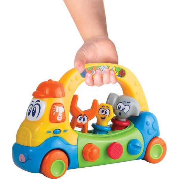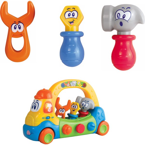 Autko z narzędziami to wspaniała gratka dla każdego małego budowniczego. Do dyspozycji nasz maluch ma młoteczek, klucz i śrubokręt, ponadto autko zleci wykonanie aż 3 zadań takich jak przykręcanie lub przybijanie. Mobilne narzędzia mają wygodny uchwyt, dzięki czemu w prosty sposób przetransportuje je. Samochodzik gra muzykę i migocze światełkami gdy wciśniemy jego czerwoną czapeczkę.