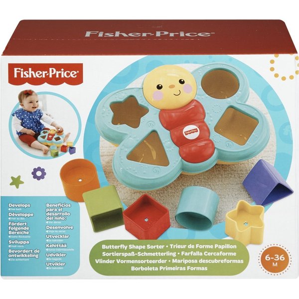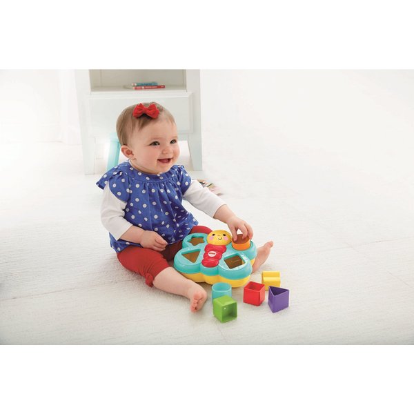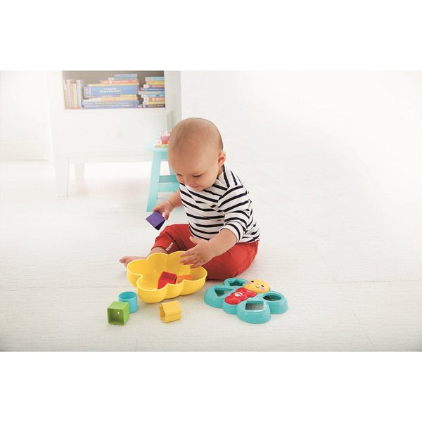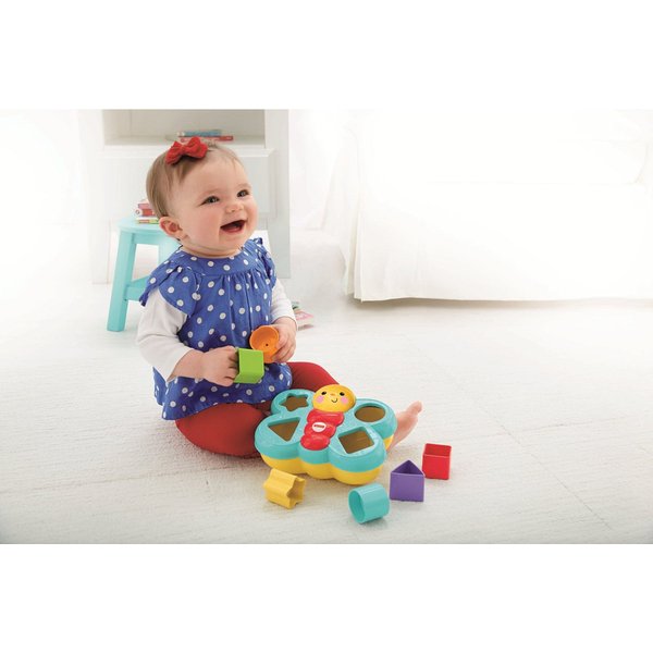 Sześć kolorowych klocków o różnych kształtach można wrzucać i dopasowywać do otworów na skrzydełkach motylka! Motylka można również otworzyć i przesypywać elementy, mnóstwo zabawy z dzieckiem na różne sposoby!