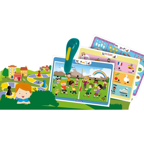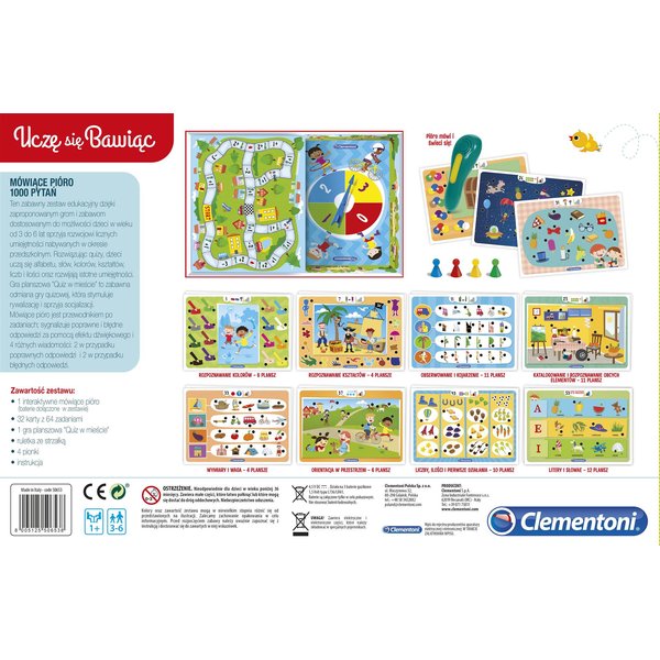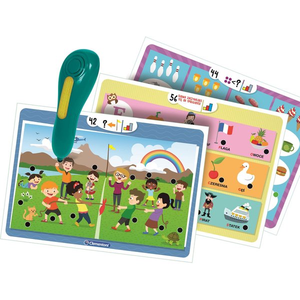 Mówiące pióro od Clementoni to nauka i wesoła zabawa w jednym!Gra zawiera aż 32 karty, które wprowadzą twojego malucha m.in. w świat kolorów, pierwszych liczb, czy kształtów! Dzięki ciekawym zadaniom nauczy się liter, nazw zwierząt czy podstawowych słów. Wybierz jedną z kart i rozpocznij grę. Wciśnij odpowiedź za pomocą dołączonego pióra i sprawdź, czy udało ci się dobrze rozwiązać quiz. Gdy pióro zaświeci oraz wyda dźwięk odpowiedź jest prawidłowa! Ten zestaw to, aż 1000 pytań, które zapewnią wspaniałą i rozwijającą zabawę przez wiele godzin. Quiz rozwija pamięć dziecka, uczy logicznego myślenia oraz koncentracji, a także daje możliwość aby dzieci same sprawdzały czy dobrze rozwiązały zagadkę.