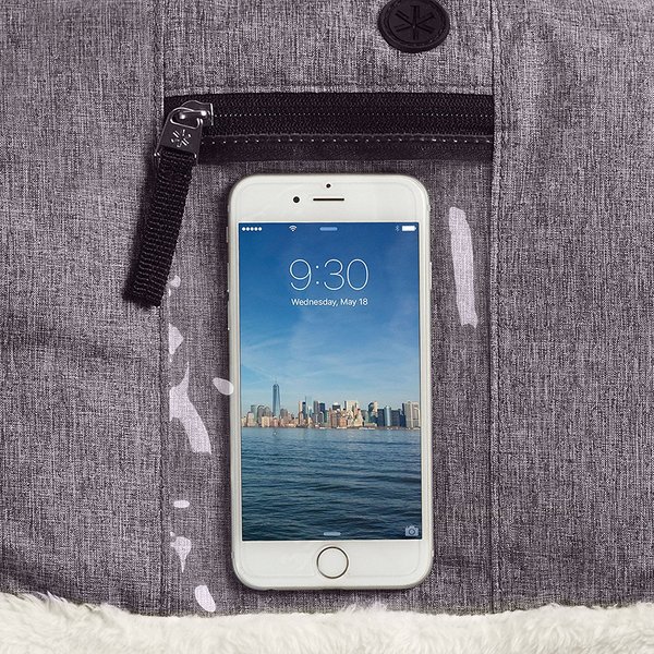 Mufka ma przezroczystą kieszeń przeznaczoną na telefon oraz wyjście na kabelek.