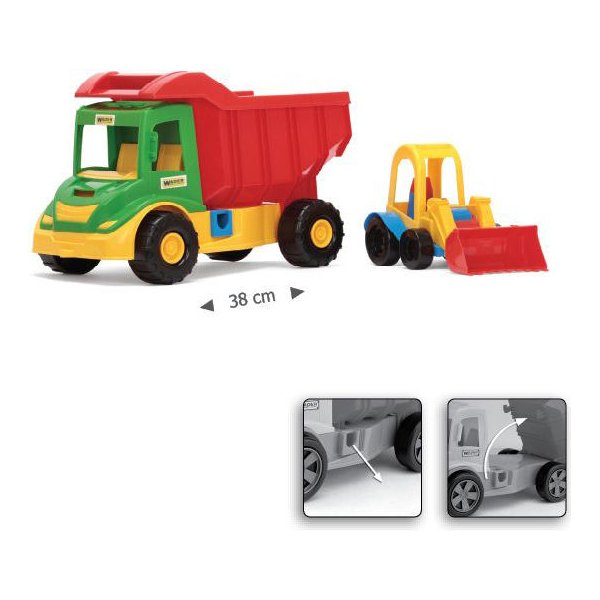 Dodatkowo w zestawie znajduje się autko-koparka z ruchomą łyżką.