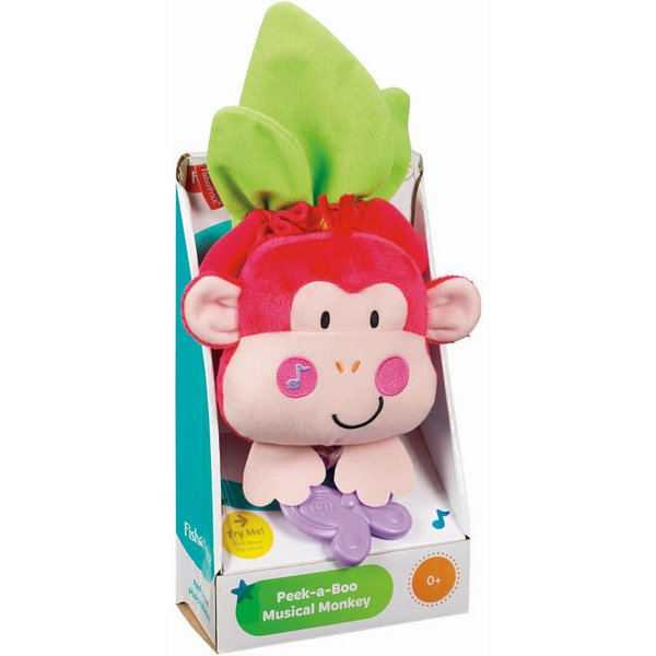 Małpka chowa się za zielonym listkiem i bawi się w Akuku. Jest mięciutka i kolorowa. Będzie idealnym przyjacielem dla maluszka.