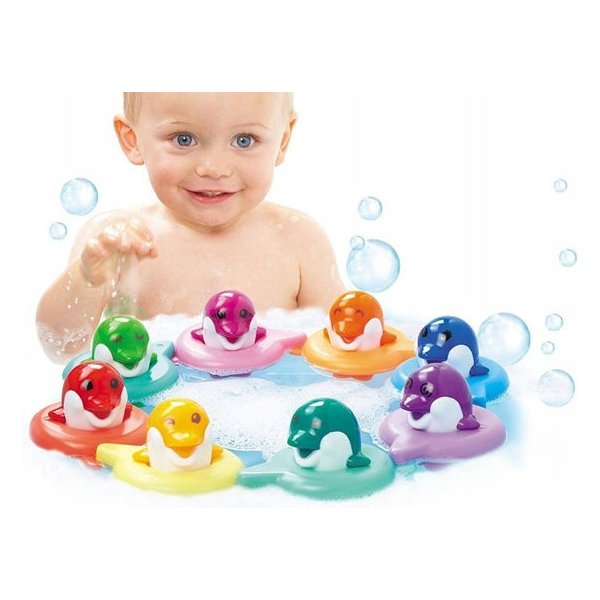 Muzyczne delfinki w pełni umilą czas dziecka podczas kąpieli. Kolorowe kółka ratunkowe połóż na wodzie, w taki sposób by utworzyły krąg, umieść muzyczne delfinki w każdym z nich. Cała gromadka jest już gotowa do muzycznej kąpieli! Dotknij ich główek, aby wydały kolejno odgłosy "Do..Re..Mi..". Teraz już na pewno Twój maluszek w pełni polubi każdą kąpiel!