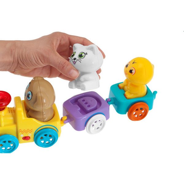 Usadź wesołe zwierzątka w pociągu i ruszaj przed siebie! W lokomotywie kręcą się koła, maluszek może pchać ją po całym pokoju i ćwiczyć raczkowanie. Gdy naciśniesz komin on zaświeci się i będzie wydawał dźwięk jadącego pociągu.