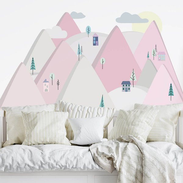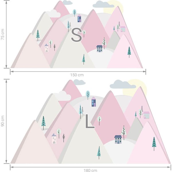 Wysokie, różowe góry z drzewami, domkami, chmurkami i słonkiem spodobają się każdej małej dziewczynce, szybko odmieniając nudny kolor ścian bez konieczności kłopotliwego malowania lub przyklejania tapety. Naklejka idealnie będzie pasowała nad łóżkiem malucha lub w kąciku zabaw, ochraniając ścianę przed zabrudzeniami.