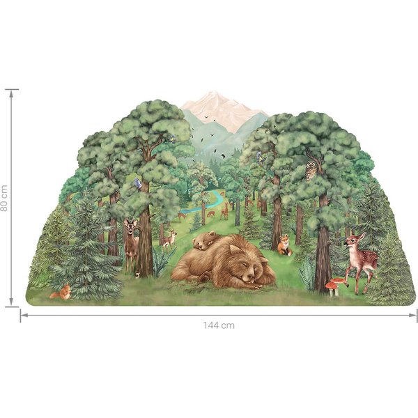 Piękny widok lasu z jego mieszkańcami zachwyci maluszka, który lubi przyrodę, szybko odmieniając nudny kolor ścian bez konieczności kłopotliwego malowania lub przyklejania tapety. Dzikie zwierzęta, grzyby, drzewa, paprocie, strumyki i góry tworzą leśny świat, w którym jest miejsce na ciszę, relaks ale także wesołą zabawę. Naklejka idealnie będzie pasowała nad łóżkiem malucha lub w kąciku zabaw, ochraniając ścianę przed zabrudzeniami.