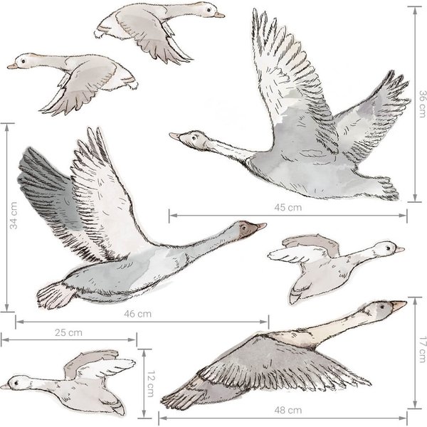 Pastelowe naklejki z gąskami w locie spodobają się każdemu małemu miłośnikowi przyrody, szybko odmieniając nudny kolor ścian bez konieczności kłopotliwego malowania lub przyklejania tapety. Wykonane zostały z bezpiecznej dla dzieci najwyższej jakości folii, pokrytej matowym laminatem. Wykazują dużą odporność na zarysowania, a dzięki temu, że nie posiadają tła, możesz je nakleić na podłożu o dowolnym kolorze.