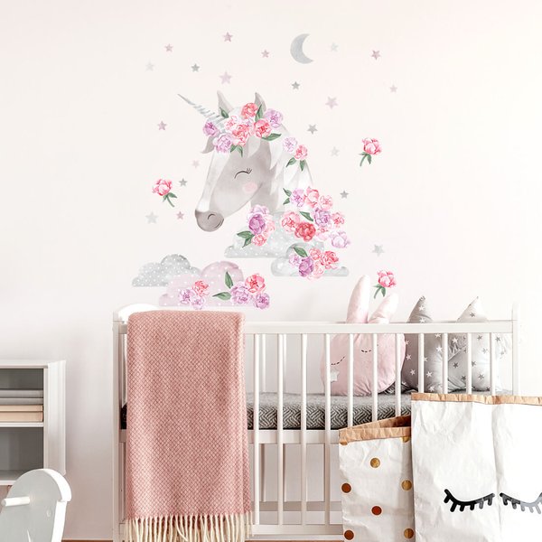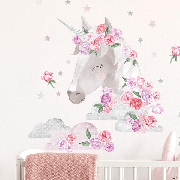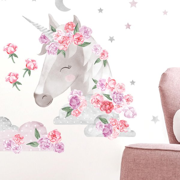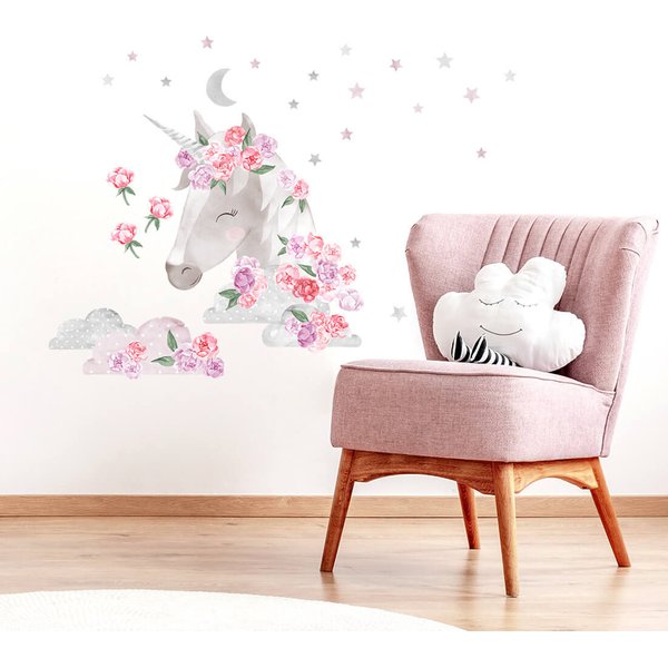 Śliczne naklejki z jednorożcem w chmurkach, kwiatach i mnóstwem szarych gwiazdek zrobią wrażenie na każdej dziewczynce, szybko odmieniając nudny kolor ścian bez konieczności kłopotliwego malowania lub przyklejania tapety. Naklejki wykonane zostały z bezpiecznej dla dzieci najwyższej jakości folii, pokrytej matowym laminatem. Wykazują dużą odporność na zarysowania, a dzięki temu, że nie posiadają tła, możesz je nakleić na podłożu o dowolnym kolorze.
