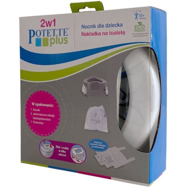 Potette Plus to tradycyjny nocnik i nakładka na toaletę w jednym, który zdecydowanie ułatwi zarówno rodzicom, jak i dziecku przejście okresu odpieluszkowania i nauki samodzielnego korzystania z toalety. Nóżki można łatwo i szybko rozłożyć i złożyć tworząc nocnik lub nakładkę - to proste! Dzięki niewielkim wymiarom oraz wadze to idealny wybór zarówno do domu, na spacer, jak i długich podróży.