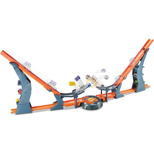 Dwie rampy, które można ułożyć równolegle lub przeciwstawnie do siebie, wyrzucą w powietrze dwa specjalne samochodziki! Samochodziki mają chwytaki, w których możesz zamontować różne przedmioty, aby zderzenia były jeszcze efektowniejsze. Ścigaj się równolegle lub zderzaj ze sobą dla efektownych kraks.