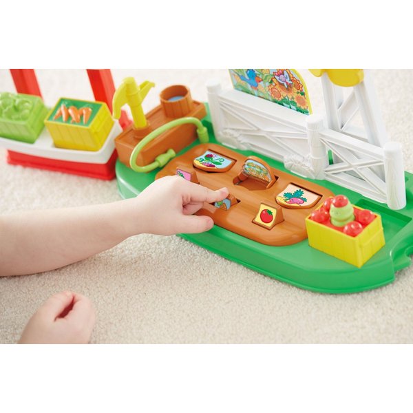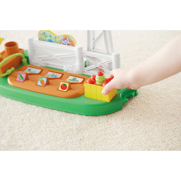 W zestawie znajduje się pompa do wody, pod którą można napełnić wiadro i podlać słoneczniki. Wiatrak umieszczony w ogrodzie można kręcić, a warzywa wyrastają po naciśnięciu na przycisk. Gdy naciśnie się guzik, naszym oczom ukażą się wszelkie uprawy, które nagle urosły! Jabłka wraz z uśmiechniętym robaczkiem, a także sałata szybko napełniają skrzynkę.