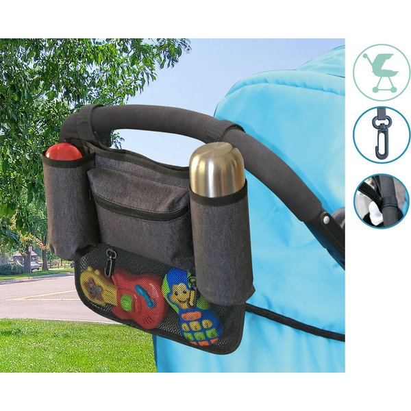 Organizer wyposażony jest w przestronne kieszenie, które pomieszczą wszystko co niezbędne na spacerze: butelkę na mleko lub kubek na sok, przekąskę, zabawkę i wiele więcej. Dzięki temu na codzienne spacery mama nie musi zabierać dużej torby do wózka. Uchwyty na rzepy umożliwiają mocowanie do dowolnego modelu wózka. Organizer jest wykonany z wytrzymałego i łatwego do utrzymania w czystości materiału.