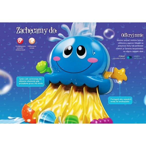 Kubek w kształcie delfina pozwala na wlewanie wody do ośmiornicy. Aby woda ruszyła z wodospadu wystarczy użyć muszelki lub gwiazdki! Wodospad uruchamia kolorowe młynki, wesoło przelewając się przez morskie zwierzątka.