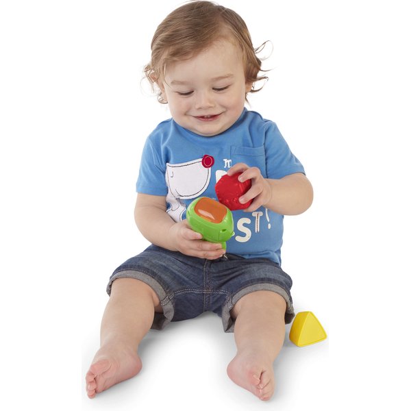- Centrum zabaw - koszyk kryje wiele atrakcji manualnych. Jest tu grzechotka w kształcie cukierka, kolorowy wiatraczek, wyskakująca moneta, a także sorter z kolorowymi klockami o różnych kształtach.