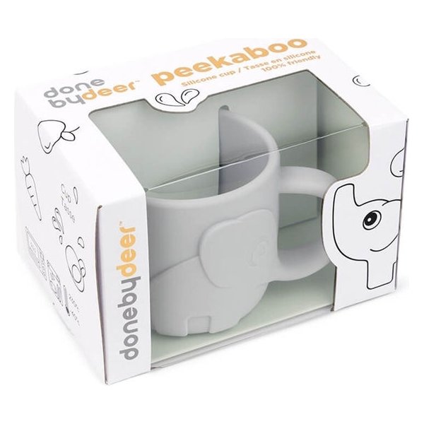 Nauka samodzielnego picia będzie łatwiejsza z uroczym kubkiem silikonowym Peekaboo Elphee marki Done by Deer.