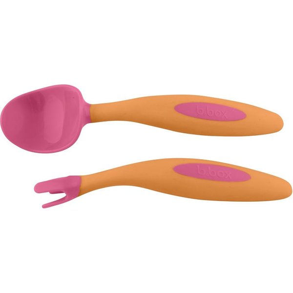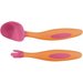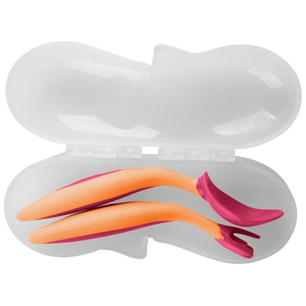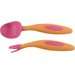 Zestaw składa się z praktycznej łyżeczki oraz specjalnie zaprojektowanego widelca, który dzięki niewielkim rozmiarom bez problemu zmieści się w ustach maluszka. Uchwyty kątowe ułatwiają trzymanie w małych rączkach, a gumowa powłoka dodatkowo chroni przed ześlizgiwaniem się sztućców podczas nabierania jedzenia.
