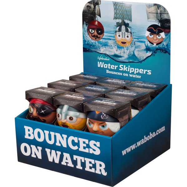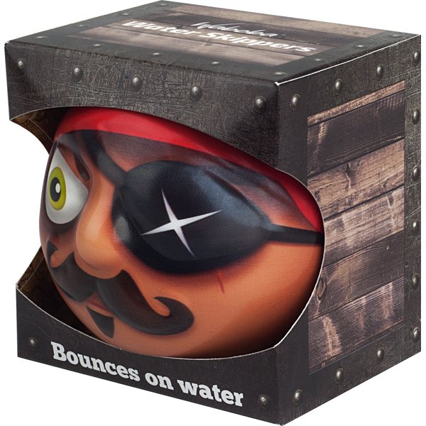 Odbijająca się od wody piłka Skippers marki Waboba doskonale sprawdzi się podczas zabaw w ogrodowym basenie, morzu czy nawet w wannie. Niezawodne odbicie od tafli wody sprawia, że piłka nie zatonie. Design przedstawia najbardziej znanych władców mórz i oceanów, Wikinga i Piratów.
