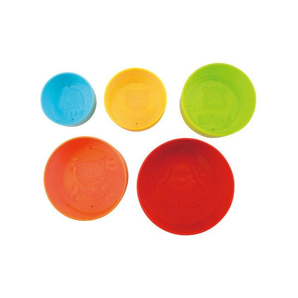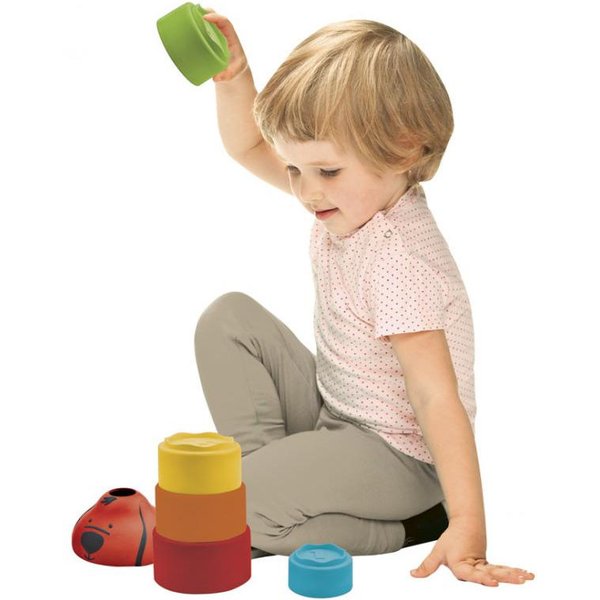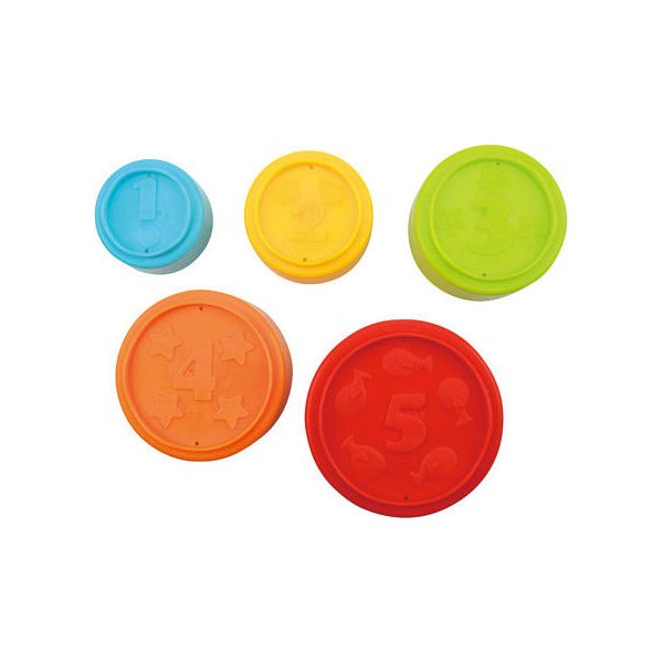 Piramidka Patrick składa się z 5 kloców o różnej wielkości i kolorach. Z jednej strony na klockach znajdują się cyferki i odpowiadająca im liczba małych wzorów, natomiast po drugiej stronie znajdują się obrazki, które będą widoczne na babeczkach z piasku. Dziecko może układać klocki jedno na drugim lub tworzyć z nich inne kombinacje - wszystko zależy od jego wyobraźni. Mnogość kolorów, ciekawe obrazeczki ze zwierzątkami i cyferki pobudzają zmysły dziecka i zwiększają frajdę!