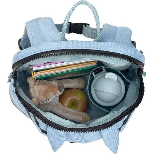 - zapięcie na zatrzask umieszczone z przodu, na klatce piersiowej stabilizuje plecak, odciążając plecy malucha, z możliwością regulacji do wzrostu dziecka,