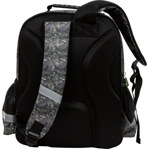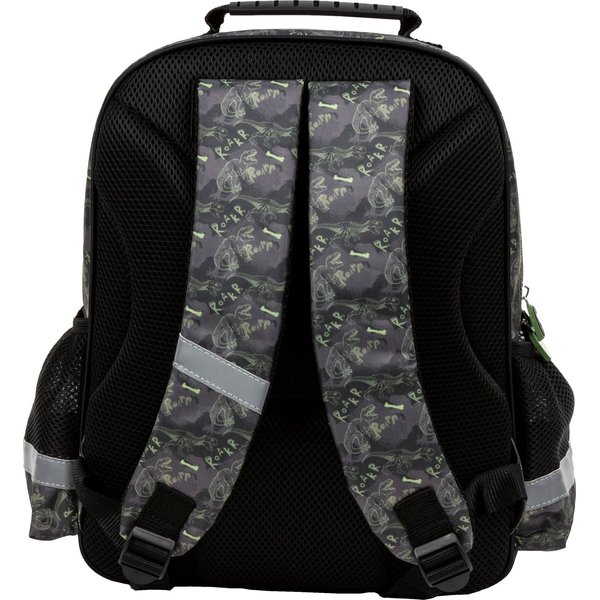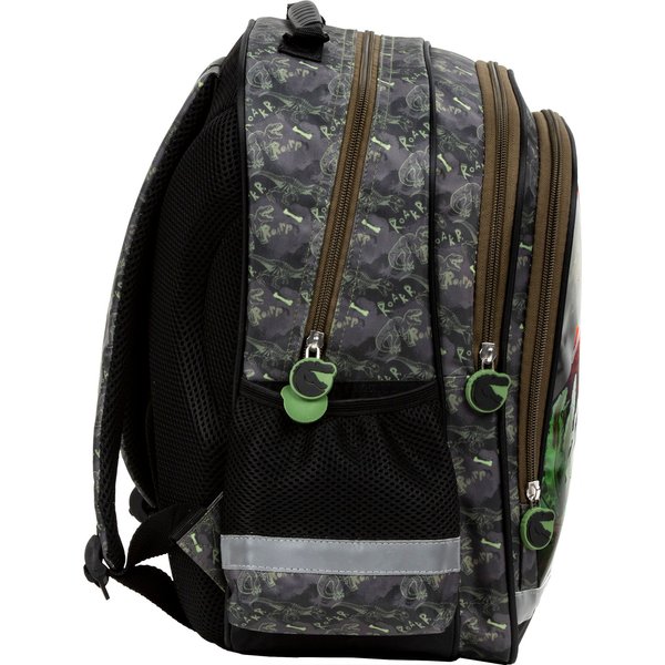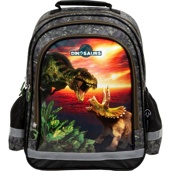 Model ten wykonano z trwałego, odpornego na przeciekanie materiału poliestrowego. Jego zwracający uwagę design zachwyci każdego małego miłośnika prehistorycznych gadów. Praktyczny podział na dwie obszerne komory ułatwi organizację wszystkich zeszytów i książek. Z przodu mieści się jeszcze duża kieszeń zamykana na zamek, w której zmieści się śniadaniówka lub piórnik. Po bokach plecaka znajdują się dwie otwarte kieszonki na bidon z wodą.