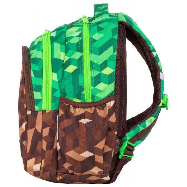 Dwie pojemne komory pomieszczą wszystkie zeszyty i książki. W środku znajdują się wewnętrzne kieszonki i przegrody, ułatwiające utrzymanie porządku i posegregowanie drobiazgów. Jest także kieszonka na telefon, przywieszka na klucze. Przednia kieszeń zamykana na suwak to dodatkowe miejsce do przechowywania drobiazgów, które zawsze muszą być pod ręką. Dwie zewnętrzne, otwarte kieszenie boczne pomieszczą bidony z wodą. Plecak został wykonany z odpornego na uszkodzenia i wodoodpornego poliestru, a jego dno zostało dodatkowo wzmocnione.