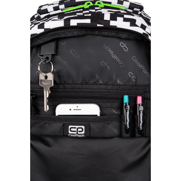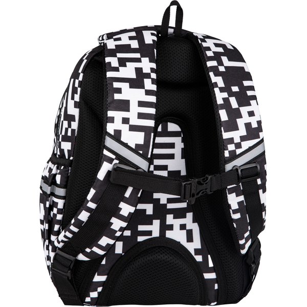 Dwie pojemne komory pomieszczą wszystkie zeszyty i książki. W środku znajdują się wewnętrzne kieszonki i przegrody, ułatwiające utrzymanie porządku i posegregowanie drobiazgów. Jest także kieszonka na telefon, przywieszka na klucze. Przednia kieszeń zamykana na suwak to dodatkowe miejsce do przechowywania drobiazgów, które zawsze muszą być pod ręką. Dwie zewnętrzne, otwarte kieszenie boczne pomieszczą bidony z wodą. Plecak został wykonany z odpornego na uszkodzenia i wodoodpornego poliestru, a jego dno zostało dodatkowo wzmocnione.
