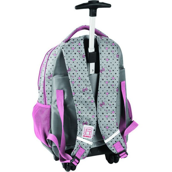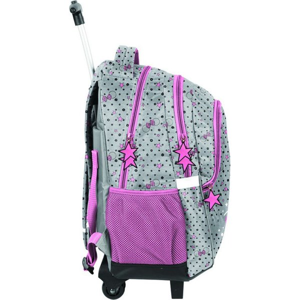 Plecak na kółkach od Paso z oryginalnym wzorem! Z takim ekwipunkiem dziecko chętnie będzie chodziło do szkoły. Posiada on specjalną budowę, która umożliwi odpowiednią organizację. Wyposażony w dwie duże komory zapinane na zamek, które pozwolą bezpiecznie przechować zawartość. Dodatkowe kieszenie znajdują się na froncie oraz po bokach - te wykonane są z siatki. Boczne kieszonki bez problemu przechowają butelkę czy bidon na napój. Wyposażony został w kółka z PCV, które są wytrzymałe i chronią dno plecaka przez uszkodzeniem. Miękka, teleskopowa rączka pozwoli dostosować jej wysokość do wzrostu dziecka. Plecak posiada również chowany stelaż ze specjalną osłonką. Całość uszyta została z materiału wodoodpornego.