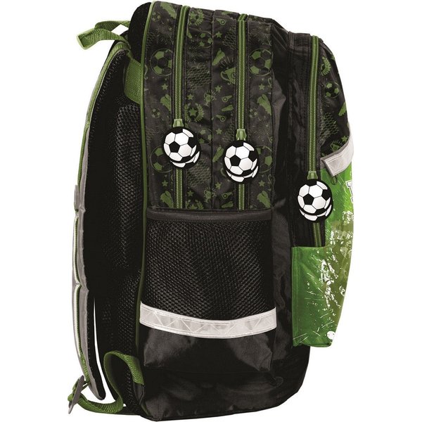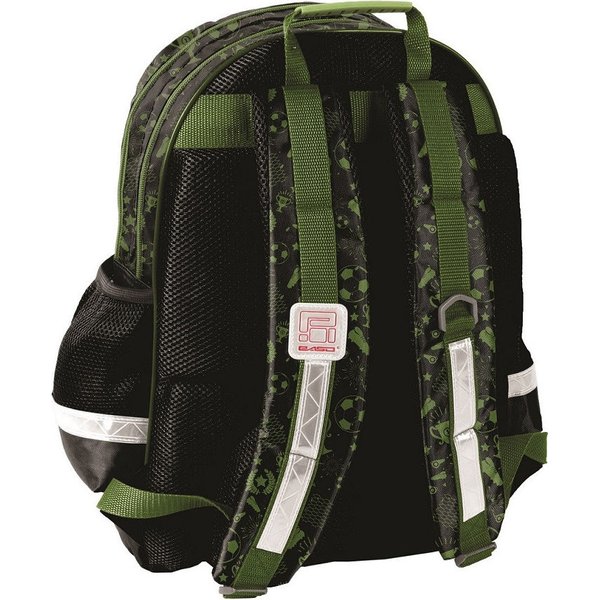 Szkolny plecak od Paso dla miłośników piłki nożnej! Z takim ekwipunkiem dziecko chętnie będzie chodziło do szkoły. Posiada on specjalną budowę, która umożliwi odpowiednią organizację. Wyposażony w dwie duże komory zapinane na zamek, które pozwolą bezpiecznie przechować zawartość. Dodatkowe kieszenie znajdują się na froncie oraz po bokach - te wykonane są z siatki. Boczne kieszonki bez problemu przechowają butelkę czy bidon na napój. Dla zwiększenia bezpieczeństwa, plecak wyposażony został w elementy odblaskowe, które zwiększą widoczność dziecka. Plecy zostały usztywnione gąbką i odpowiednio wyprofilowane, a całość pokryta siatką. Regulacja szelek pozwoli dopasować rozmiar idealnie do wzrostu dziecka, a miękki materiał, którym zostały pokryte zapewni odpowiedni komfort. Również dno plecaka jest odpowiednio usztywnione, a całość uszyta została z materiału wodoodpornego.