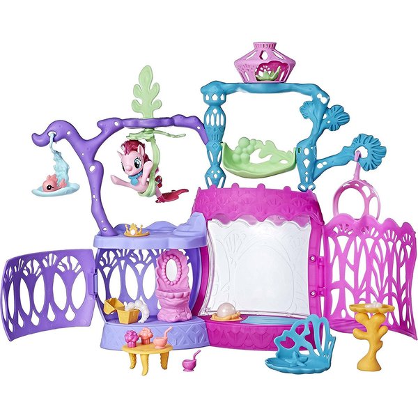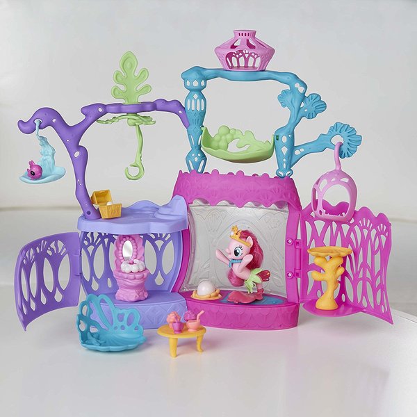 Piękny podwodny zamek zachwyci każdą dziewczynkę. Wyrusz wraz z Pinkie Pie na podwodny odpoczynek w jej zamkowym apartamencie. Umieść kucyka na karuzeli z wodorostów i zwinnie obracaj, po skończonej zabawie odpocznij na hamaku. Czeka na Ciebie niesamowita atrakcja! Wlej wodę do ściany po naciśnięciu perły obserwuj jak ściana rozbłyska światłem wypuszczając podwodne bańki - ale frajda!