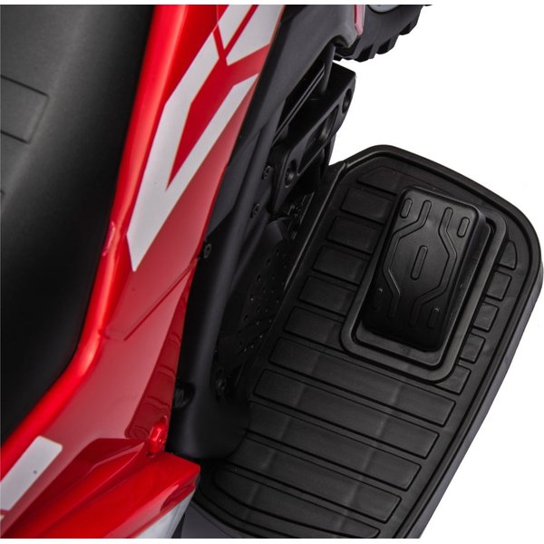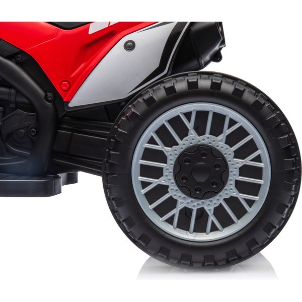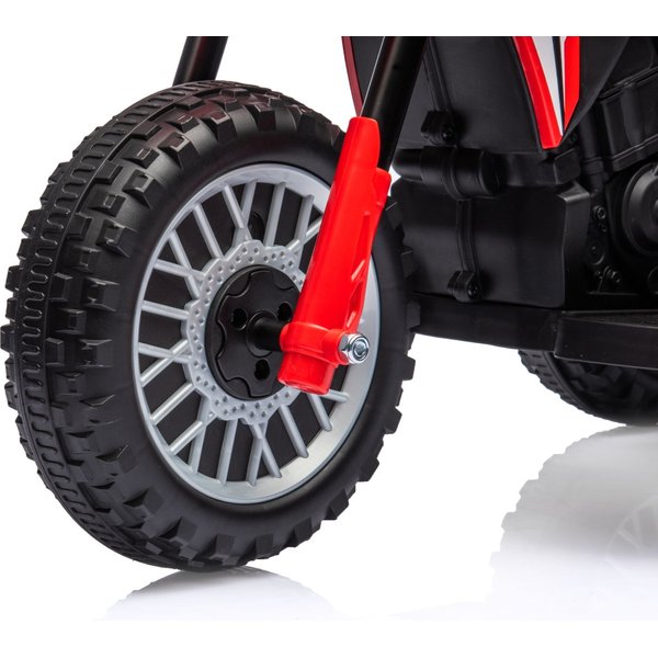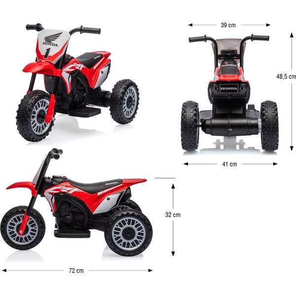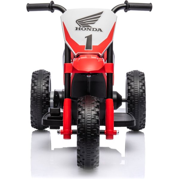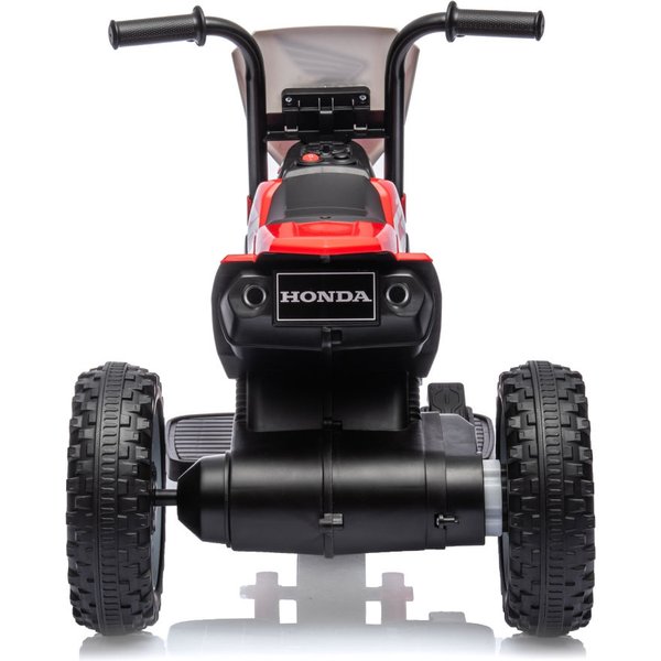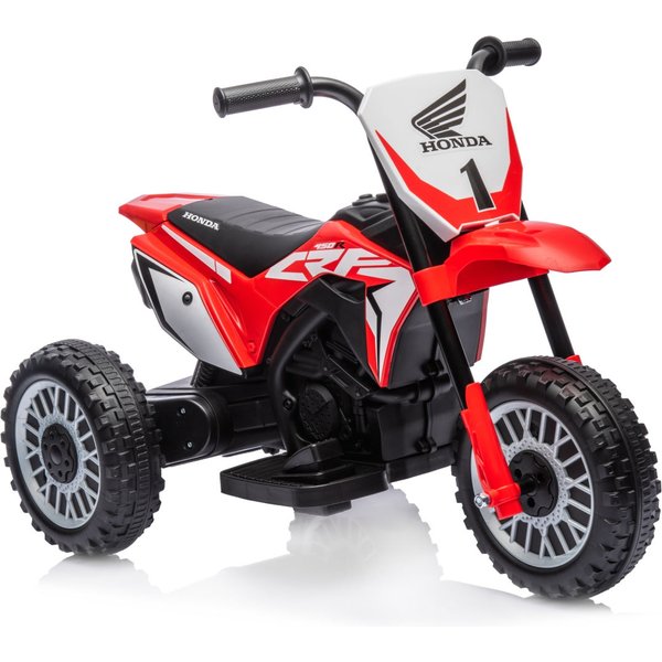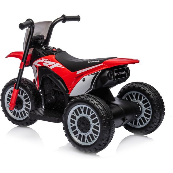 Pojazd na akumulator Honda CRF 450R Milly Mally to trójkołowiec wzorowany na słynnym modelu enduro CRF450R. Wykonany z najwyższej jakości materiałów, zapewnia bezpieczeństwo i wytrzymałość. Po włączeniu, pojazd emituje brzmienie uruchamianego silnika, a naciśnięcie pedału gazu sprawia, że motocykl rusza. Duże koła z terenowym bieżnikiem zapewniają mobilność, a wyprofilowane siedzisko gwarantuje komfort i bezpieczeństwo. Stalowe osie kółek zapewniają stabilność, a klakson dodaje jeszcze więcej zabawy. Pojazd rozwija zdolności manualne, orientację i motorykę dziecka. Dopuszczalne obciążenie to 25 kg, a przedział wiekowy to 24m+. Produkt posiada certyfikat bezpieczeństwa CE, zasilany jest akumulatorem (dołączonym do zestawu) i posiada gwarancję.