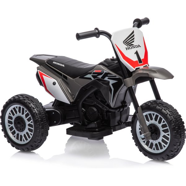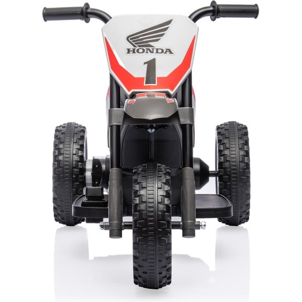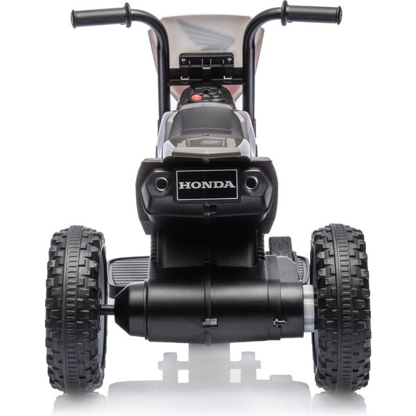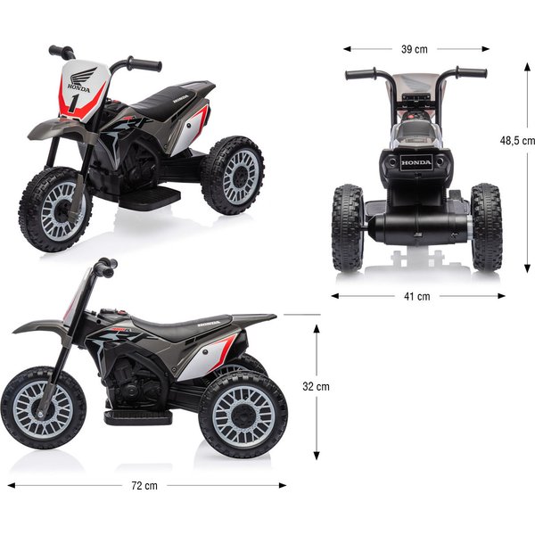 Pojazd na akumulator Honda CRF 450R Milly Mally to trójkołowiec wzorowany na słynnym modelu enduro CRF450R. Wykonany z najwyższej jakości materiałów, zapewnia bezpieczeństwo i wytrzymałość. Po włączeniu, pojazd emituje brzmienie uruchamianego silnika, a naciśnięcie pedału gazu sprawia, że motocykl rusza. Duże koła z terenowym bieżnikiem zapewniają mobilność, a wyprofilowane siedzisko gwarantuje komfort i bezpieczeństwo. Stalowe osie kółek zapewniają stabilność, a klakson dodaje jeszcze więcej zabawy. Pojazd rozwija zdolności manualne, orientację i motorykę dziecka. Dopuszczalne obciążenie to 25 kg, a przedział wiekowy to 24m+. Produkt posiada certyfikat bezpieczeństwa CE, zasilany jest akumulatorem (dołączonym do zestawu) i posiada gwarancję.
