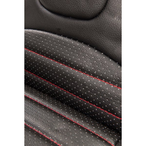 - fotel kierowcy wytapicerowany ekoskórą i przeszyty czerwoną nicią