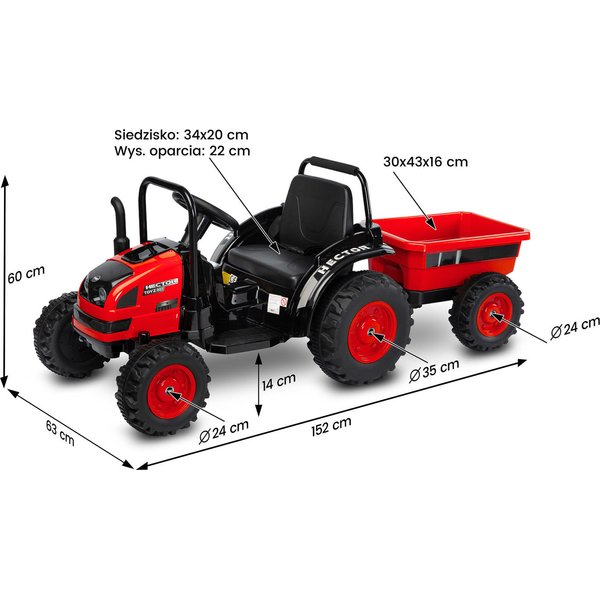 Traktor Hector od Caretero idealny do jazdy w terenie! Wyposażony został w solidne plastikowe koła, które zapewniają płynna jazdę. Natomiast mocny silnik pozwoli na poruszanie się po bardziej zaawansowanym terenie. Pojazd posiada duże siedzisko, które zapewni odpowiedni komfort podczas użytkowania. Pozwoli to na korzystanie z niego przez dzieci do 8 roku życia (max. 25 kg). Odpinana przyczepka pozwoli na przewożenie najróżniejszych rzeczy, które są potrzebne do zabawy. Dodatkowe elementy takie jak światła led czy radio z bluetooth i mp3 zapewni wiele radości podczas korzystania z niego. Pojazd wykonany został z materiałów wysokiej jakości co gwarantuje jego trwałość. Dla rodziców znajdzie się pilot, który pozwoli na zdalne sterowanie pojazdem.