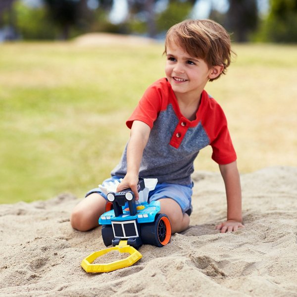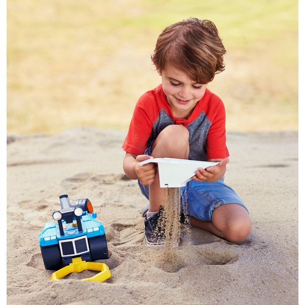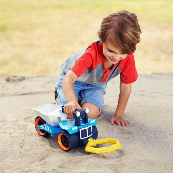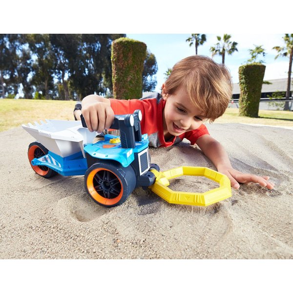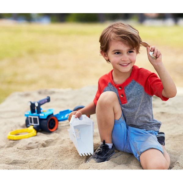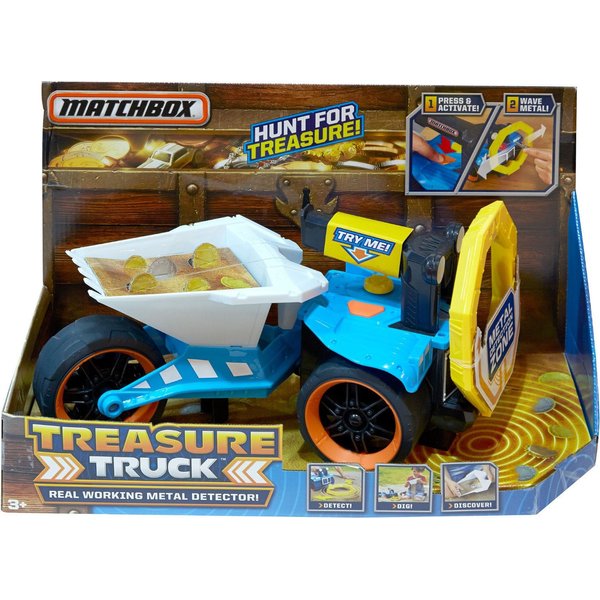 Rozpocznij szaloną przygodę razem z ciężarówką od Matchbox i wykrywaj metale w domu lub na dworze! Poruszaj się po dywanie lub piasku z obniżoną anteną pojazdu i przeszukuj teren. Wyczekuj specjalnego sygnału dźwiękowego, który uruchamia się, gdy natrafisz na metal. Teraz musisz jedynie wydostać ukryty skarb. Podczas poszukiwań w piasku z pewnością przyda ci się naczepa ciężarówki, która posłuży także jako łopatka oraz sitko. Przesiej piasek i sprawdź jaki skarb znalazłeś!