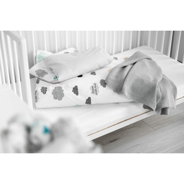 Pościel od Sensillo uszyta została z niezwykle miłej w dotyku 100% bawełny, która nie będzie powodowała podrażnień delikatnej skóry niemowlaka. Jej uroczy wygląd i delikatne barwy sprawią, że idealnie wpasuje się w wystrój dziecięcego pokoju. W komplecie znajduje się poszewka na kołdrę oraz poduszkę, które zamykane są na zakładkę.