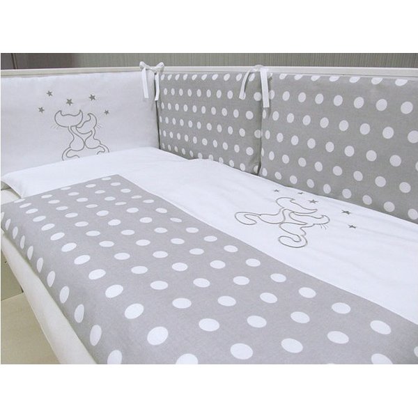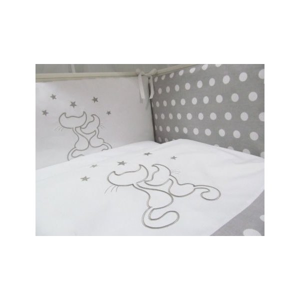 Zestaw pościeli dziecięcej z ochraniaczem na łóżeczko. Wykonany z wysokogatunkowej certyfikowanej bawełny, ozdabiany efektownymi aplikacjami. Ochraniacz składa się z trzech części, dzięki czemu można nim zabezpieczyć łóżeczko według własnego uznania. Ma zdejmowane poszewki, co ułatwia jego pranie. Wypełnienie ochraniacza, kołdry i poduszki wykonane jest z antyalergicznego materiału.