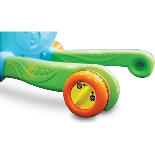 Uroczy chodzik od Dumel który kryje w sobie dwie funkcje! Nie tylko będzie doskonałą pomocą podczas stawiania pierwszych kroków i zdobywania pewności w samodzielnym poruszaniu się. Zapewni również wspaniałą, rozwijającą zabawę przez wiele godzin. Jego urocza forma z pewnością zaciekawi maluszka i zachęci do użytkowania go. Wyposażony został w wiele sensorycznych niespodzianek oraz elementów, które mają za zadanie zająć dziecko i zapewnić mu odpowiedni rozwój. Do dyspozycji będziemy mieć ruchome trybiki, terkoczącą gwiazdkę, kolorowe światełka oraz wiele zabawnych dźwięków i melodii. Dodatkowo do kompletu dołączone zostały dwa dyski, które dziecko może wrzucić do otworu i obserwować jak zjeżdżają w dół. To pozwoli zapoznać go ze związkiem przyczynowo-skutkowym. Chodzik wyposażony został w regulację prędkości, którą możemy dostosować do potrzeb i umiejętności dziecka.