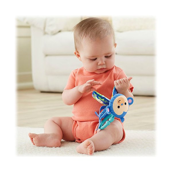 Małpka ma miękkie łapki i nóżki, które stymulują zmysł dotyku dziecka. Dołączony wieszaczek-łącznik pozwala łatwo przypiąć zabawkę nad dzieckiem - w domu lub w podróży.