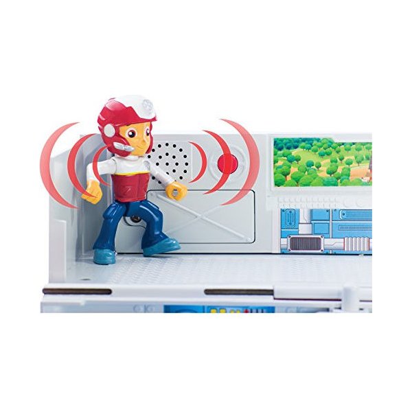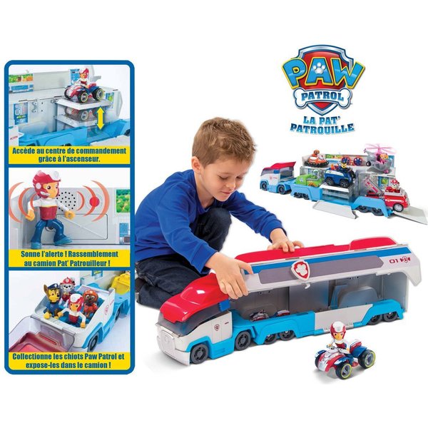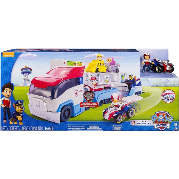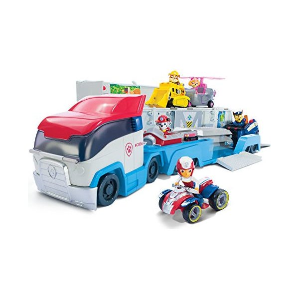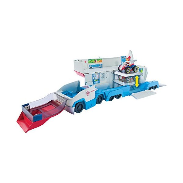 Ten wspaniały wóz wyposażony jest w 12 potężnych kół, którym nie straszne będzie żadne podłoże, na kadłubie przyczepy widnieje piękne logo Psiego Patrolu, a szyby w całym wozie są przyciemniane. Rozkładana przyczepa przeznaczona jest do transportu samochodzików psiego patrolu, posiada dwie kładki po których można wjechać, oraz windę która podniesie autko na wyższy poziom przyczepy transportera. Sama ciężarówka otwiera się gdzie możemy umieścić figurki psiaków.