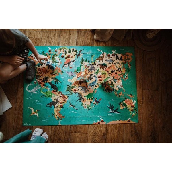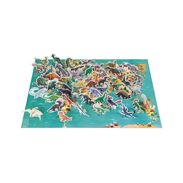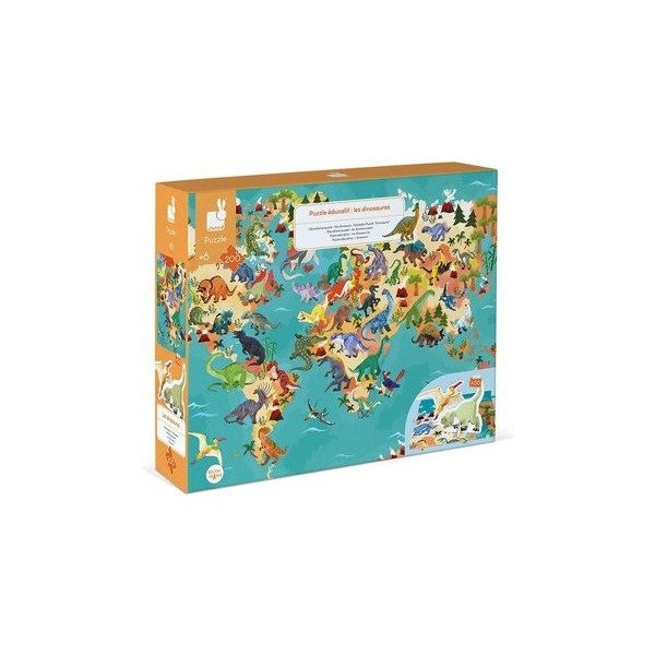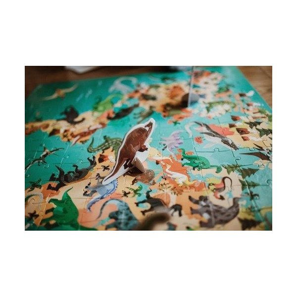 Puzzle edukacyjne od Janod zawierają 200 elementów jednak to nie wszystko! W zestawie znajdują się również figurki dinozaurów... i to nie mało! Jest ich 50! To sprawia, że oprócz frajdy z układania ilustracji przedstawiającej różne gatunki dinozaurów, maluch będzie miał jeszcze więcej pracy! Będzie mógł doskonalić umiejętności parowania elementów i każdą z figurek dopasować do jej odpowiednika na ułożonym obrazku. Każdy dinozaur posiada podstawkę. Nie będzie, więc problemu z ich ustawieniem. W zestawie maluch znajdzie również broszurę w języku polskim z nazwami i ciekawostkami dotyczącymi postaci na obrazku. Całość zapakowana w ozdobne pudełko, idealnie sprawdzi się jako prezent.