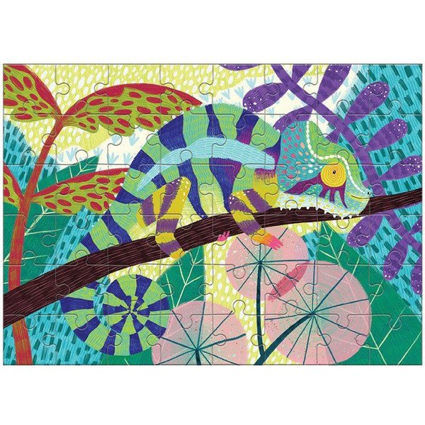 Puzzle od Mudpuppy przedstawiają kameleona. Cały zestaw składa się z 48 puzzli, które po połączeniu utworzą piękny rysunek o wymiarach 20 x 14,5 cm. Przedstawi on zwierzę w swojej ulubionej pozycji - zwisającego z gałęzi. Dodatkowo do zestawu dołączone są ciekawostki o tym gatunku. Zapakowane w ozdobne pudełko będą idealnym prezentem na różne okazje. Układanie puzzli pozwala ćwiczyć sprawność manualną i pamięć oraz koncentrację.