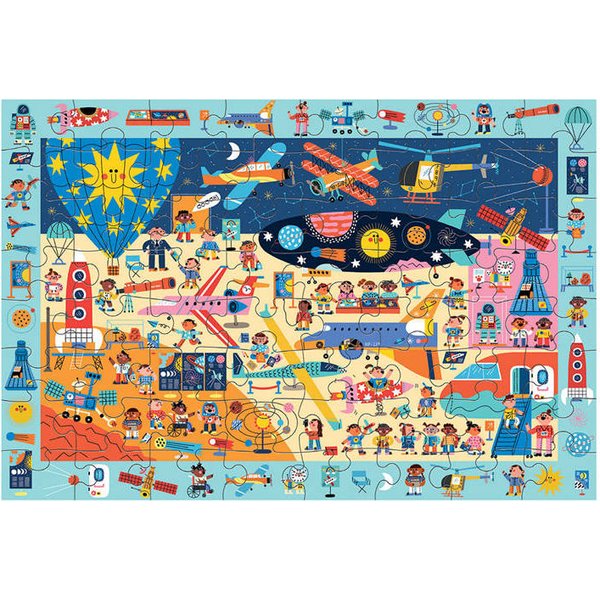 Najpierw zadaniem dziecka jest ułożenie obrazka przedstawiającego muzeum kosmosu i lotnictwa. Przyda się kreatywność, umiejętność skupienia i logiczne myślenie. Następnie dziecko może razem z rodzicem obserwować obrazek i poszukać na nim poszczególnych elementów wyróżnionych na kontrastowym pasku. Ta zabawa pozwala na rozwijanie spostrzegawczości. Kolorowe obrazki zostały zaprojektowane przez hiszpańską artystkę zafascynowaną wędrówkami i książkami - Teresę Bellon.