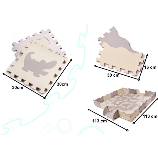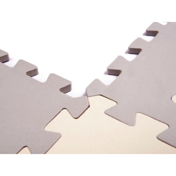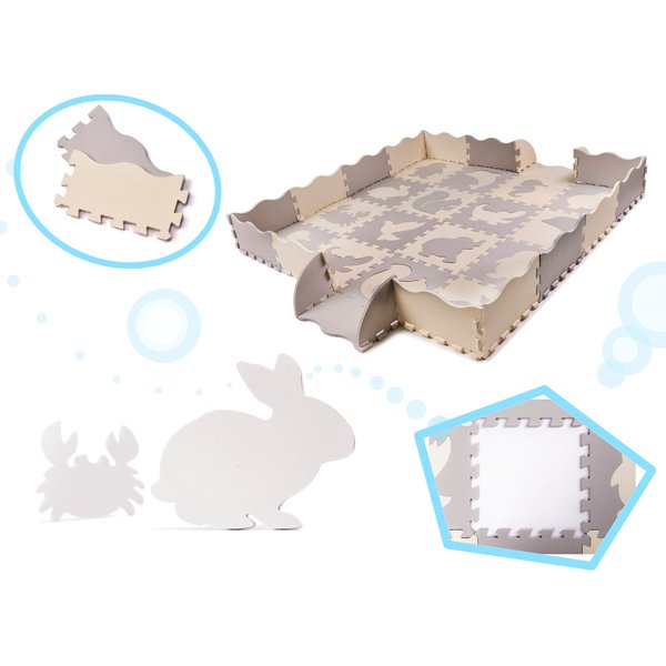 Miękkie, wykonane z antypoślizgowej i wodoodpornej pianki EVA puzzle oferują wiele sposobów zabawy. Można wyjmować poszczególne elementy z ramek, budować z nich różne konstrukcje 3D (sześciany, tunele, prostopadłościany, kojec) albo wykorzystywać jako matę chroniącą maluszka podczas zabawy na podłodze. Doskonale amortyzują każdy upadek dziecka, które dopiero uczy się chodzić, pozwolą na wesołą zabawę na podłodze, izolując od nieprzyjemnego chłodu. Puzzle posiadają kontrastową kolorystykę, a dziecko może bawić się nimi jak sorterem, dopasowując kształty do poszczególnych ramek.