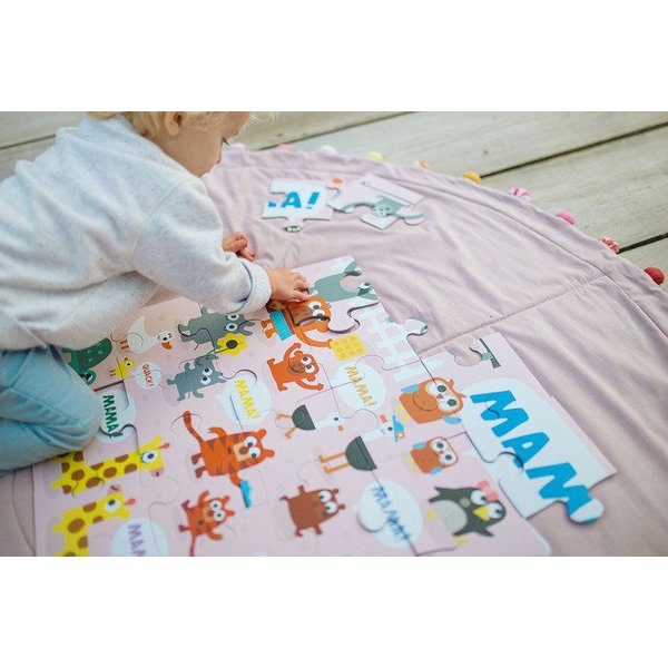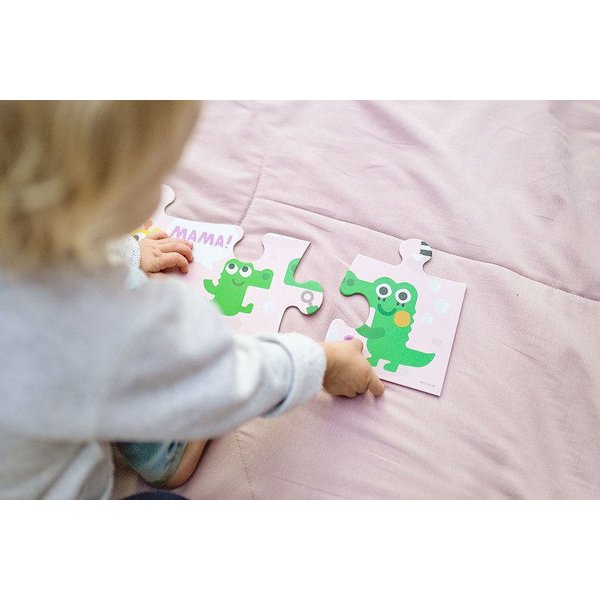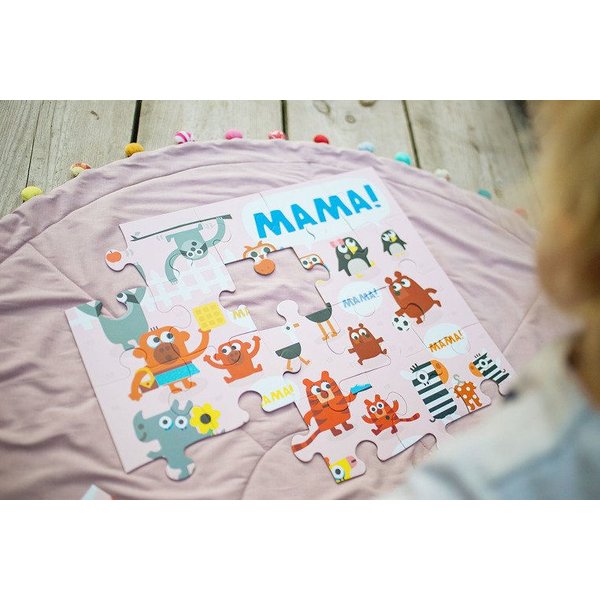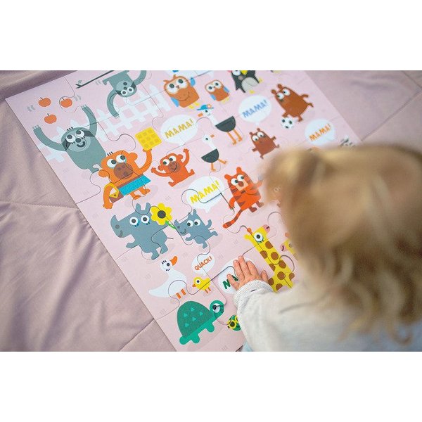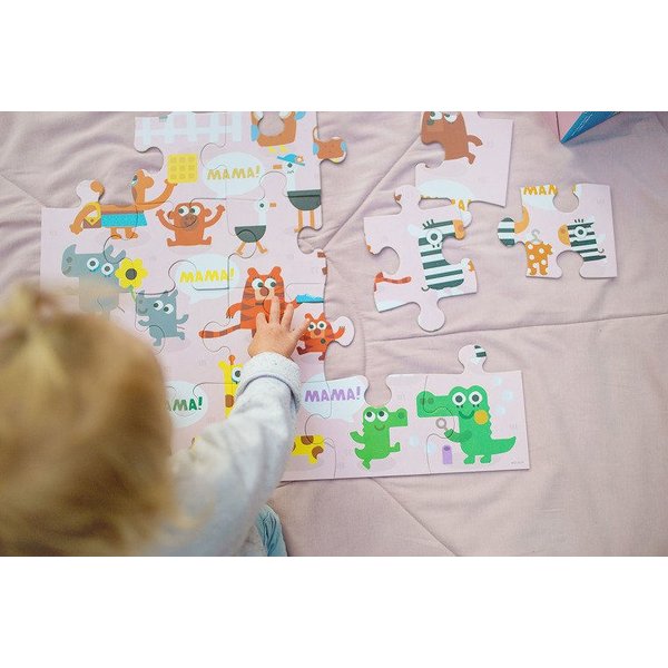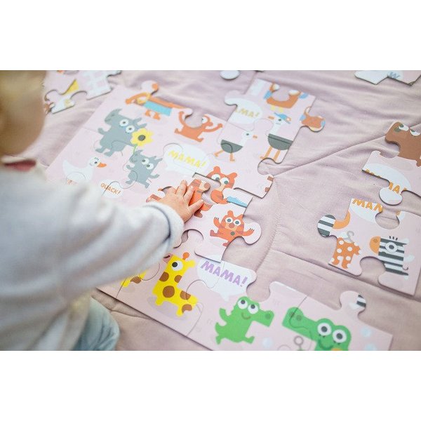 Podłogowe puzzle doskonałe do zabawy i stymulowania dotyku oraz wzroku.Puzzle posiadają 25 kawałków, które po złożeniu przedstawiają uroczy obrazek o wymiarach 56 cm x 56 cm. Całość przedstawia urocze pary - mamę i dziecko - różnych gatunków zwierząt. Układanka została zapakowana w ładne pudełko idealne na prezent.